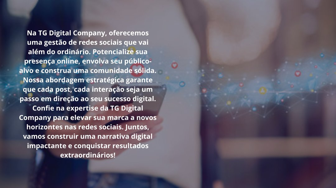 Bem-vindo à TG Digital Company em Hortolândia! Especializada em marketing digital para negócios locais, focamos em gestão de tráfego e redes sociais. Criamos estratégias personalizadas para potencializar sua presença online, conectando marcas ao público-alvo de forma inovadora. Vamos além de anúncios simples, construindo relacionamentos sólidos e marcas firmes. Se busca aumentar a visibilidade do seu negócio local e fortalecer sua presença online, estamos aqui para transformar sua narrativa digital. Juntos, construiremos o sucesso do seu negócio. Entre em contato e descubra como podemos fazer a diferença para você!